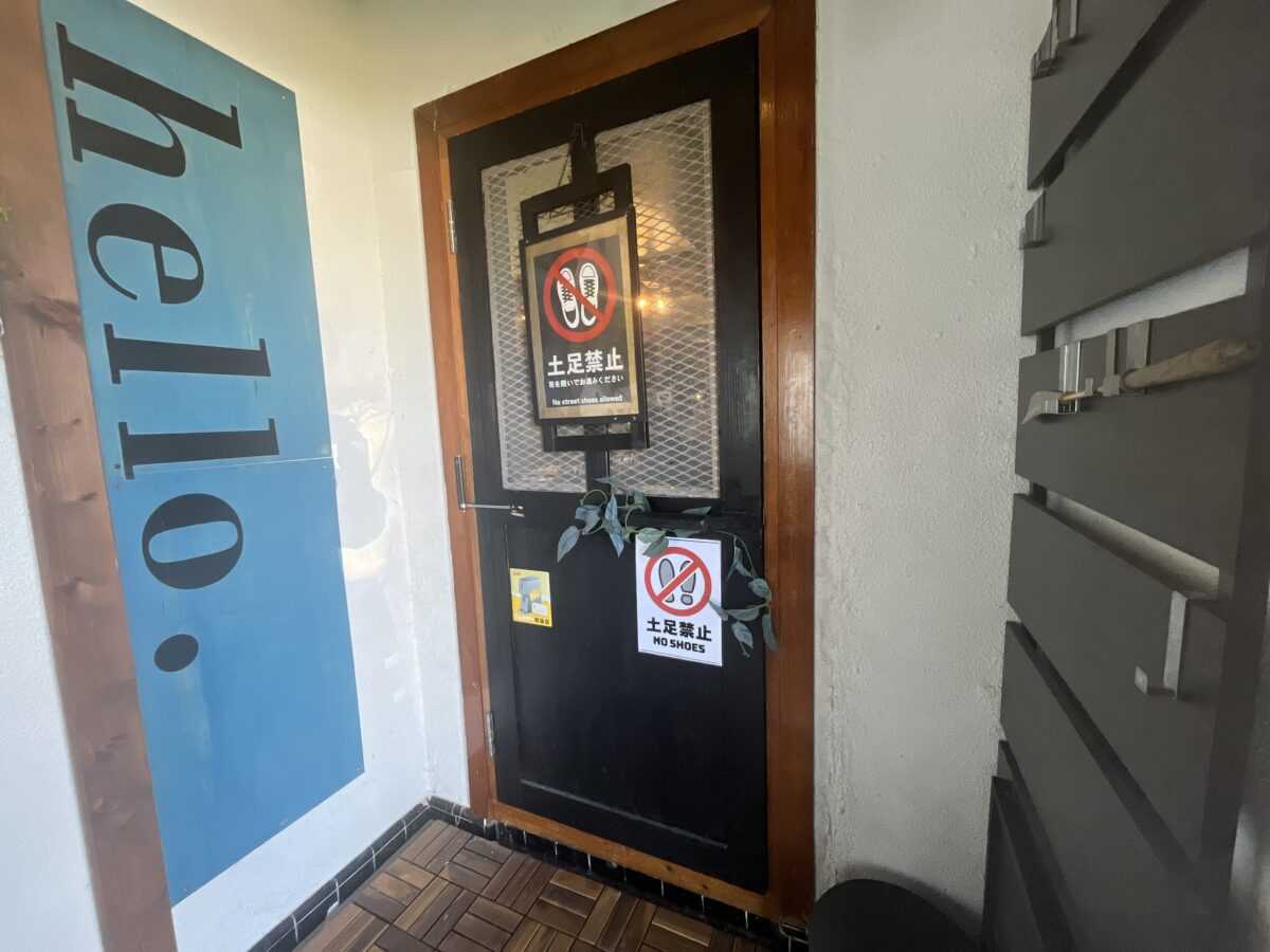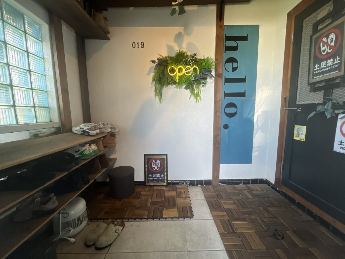 スライドドアを開けると玄関があります。こちらで靴を脱いで左の靴箱へ。そして右のドアを開けると店内です。