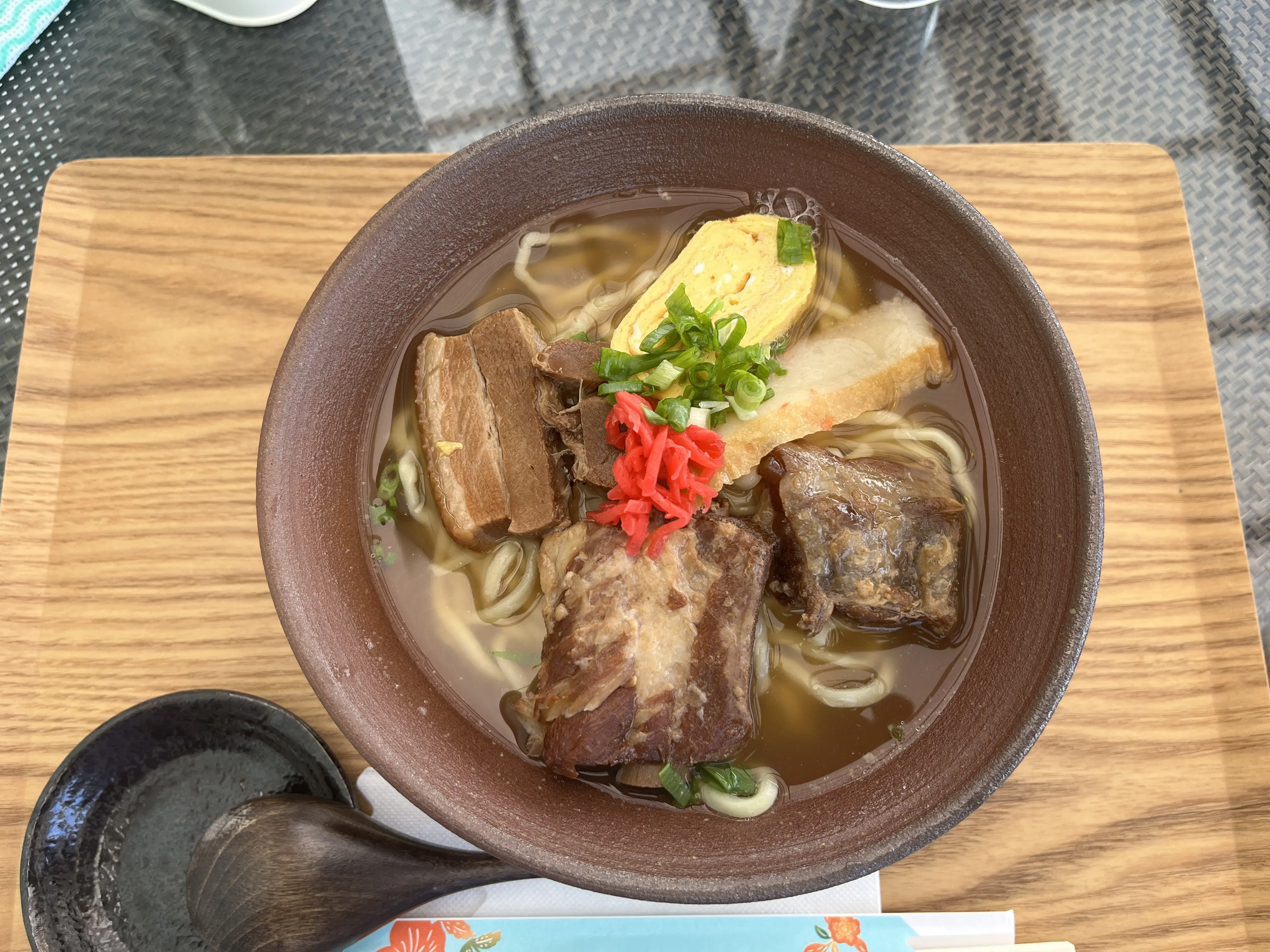 三枚肉、ソーキ、軟骨ソーキが載ってます。全部、甘々の味付けで、食感も良い。コレは超好みの味です。いらぶち情報だと黒糖を使ってるらしい。因みに玉子焼きも甘かったのだが、沖縄そばに甘い玉子焼きはちょっと合わないかなぁ。と思ったりもした。