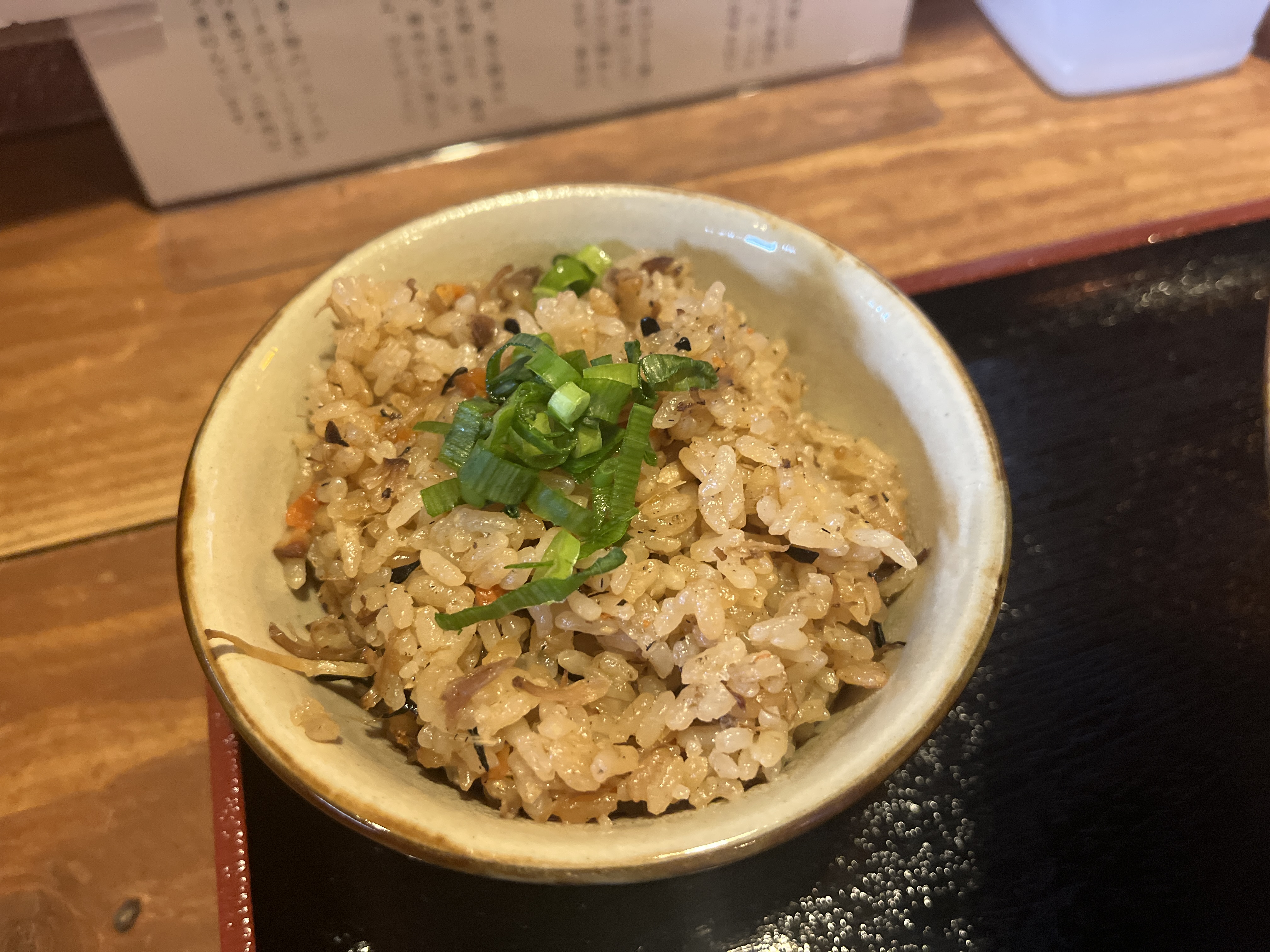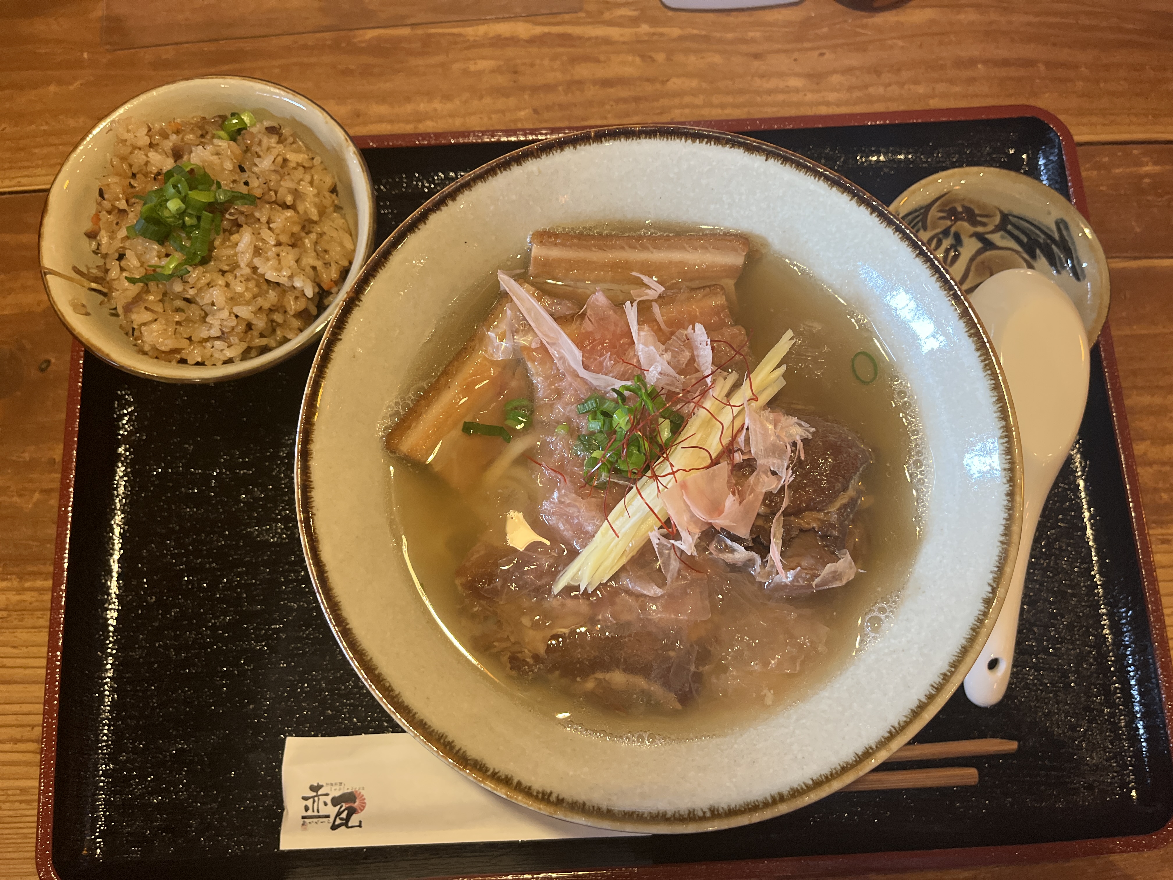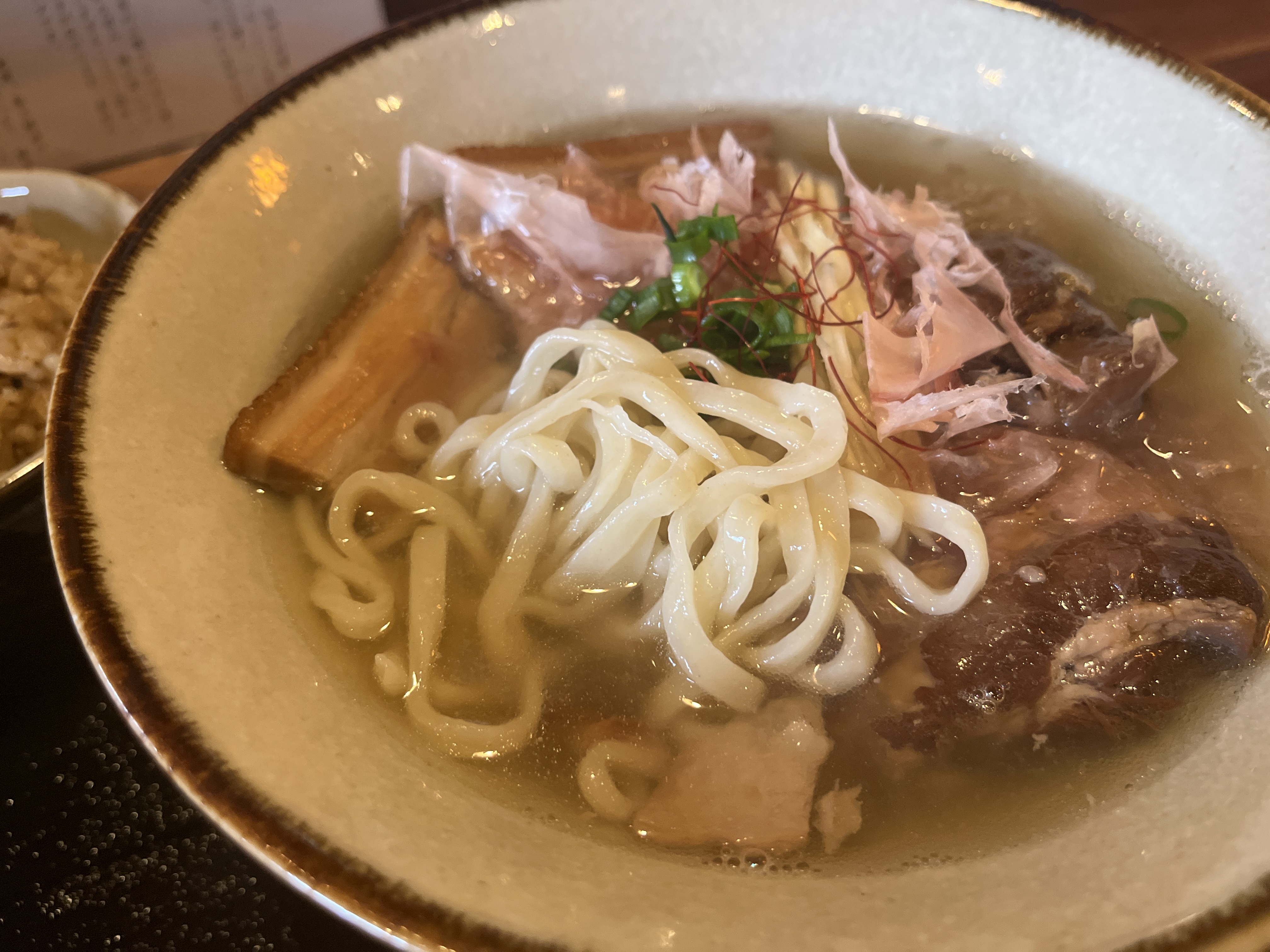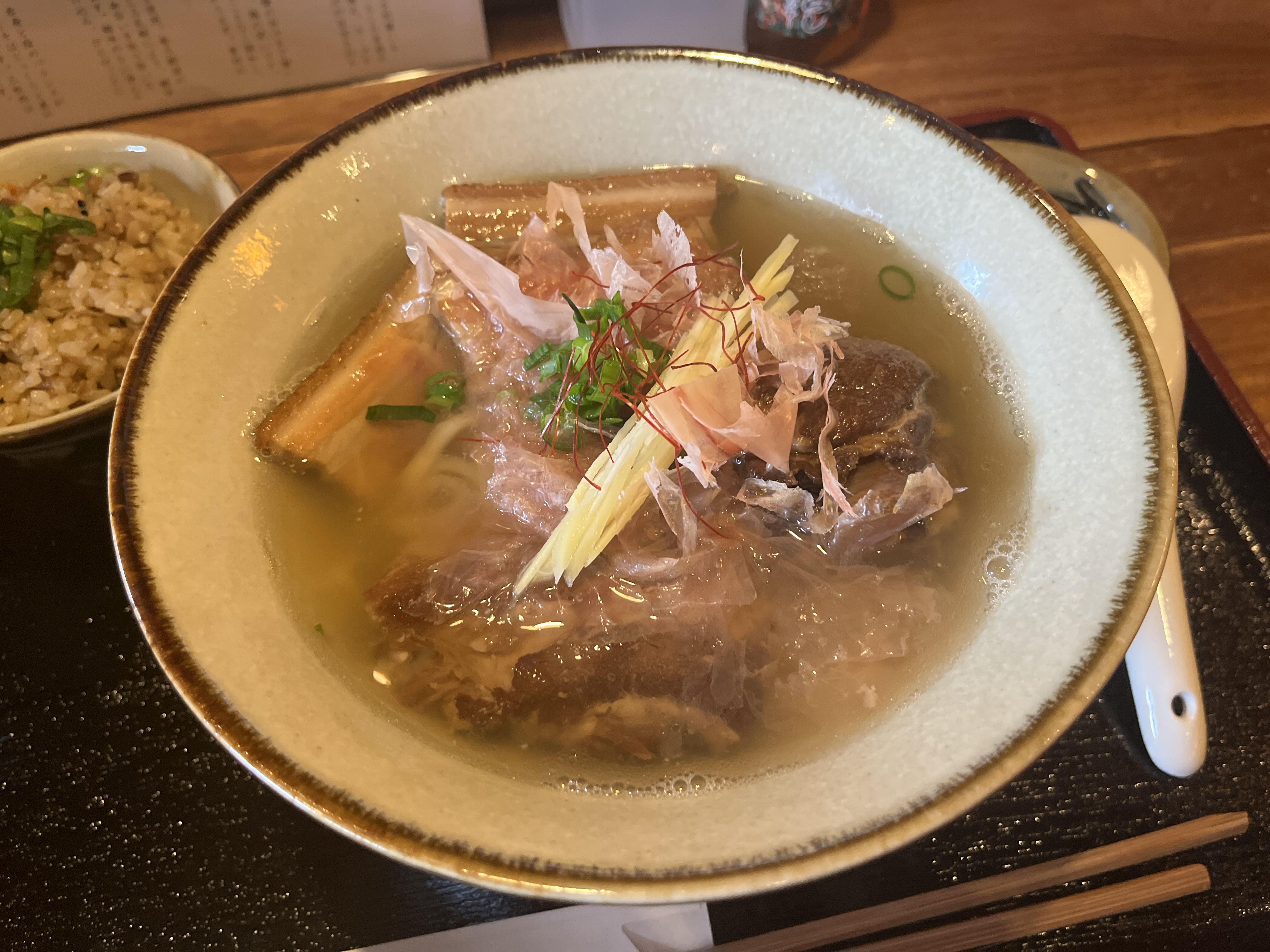 メニュー表やInstagram見てると、沖縄そばの拘りは、すんごいたくさん書いてるが、じゅーしーについては、全く書かれてない。。。のに!じゅーしーも美味いっす!私は、あっさりパラパラが好きですが、コチラはコクありしっとりタイプ。好みと逆だが、美味い!食堂系のじゅーしーと違う。沖縄料理屋さんのじゅーしーですね。一口食べると箸が止まらない。(沖縄そばとバランス良く交互に食べたいけど)油断すると、一気に完食しちゃいそうです。