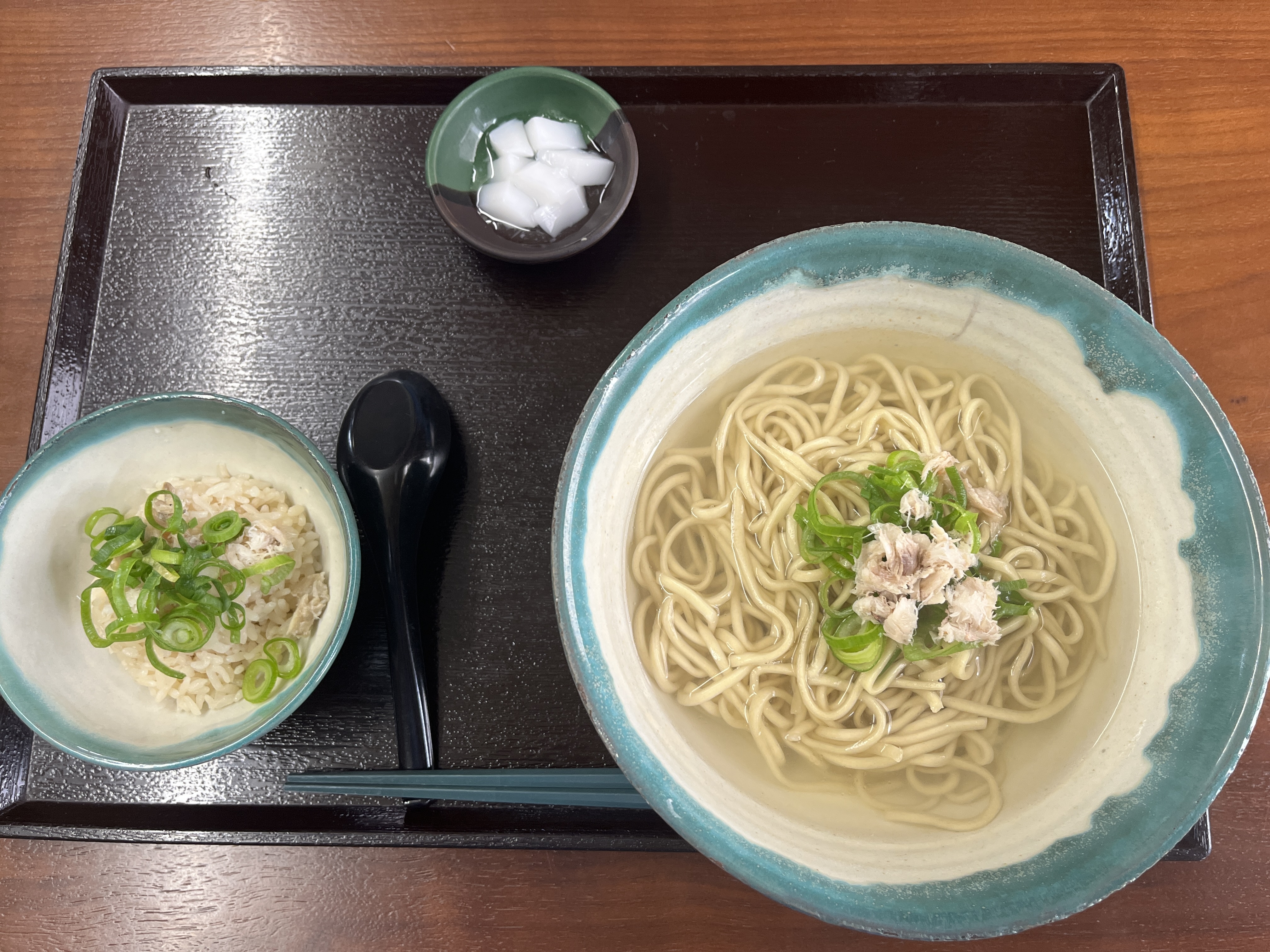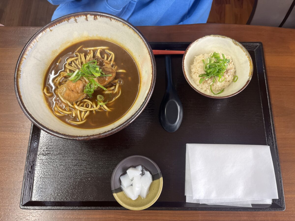 鯛だしカレーそばは、鯛だしカレーそばと鯛めし、杏仁豆腐のセットです。