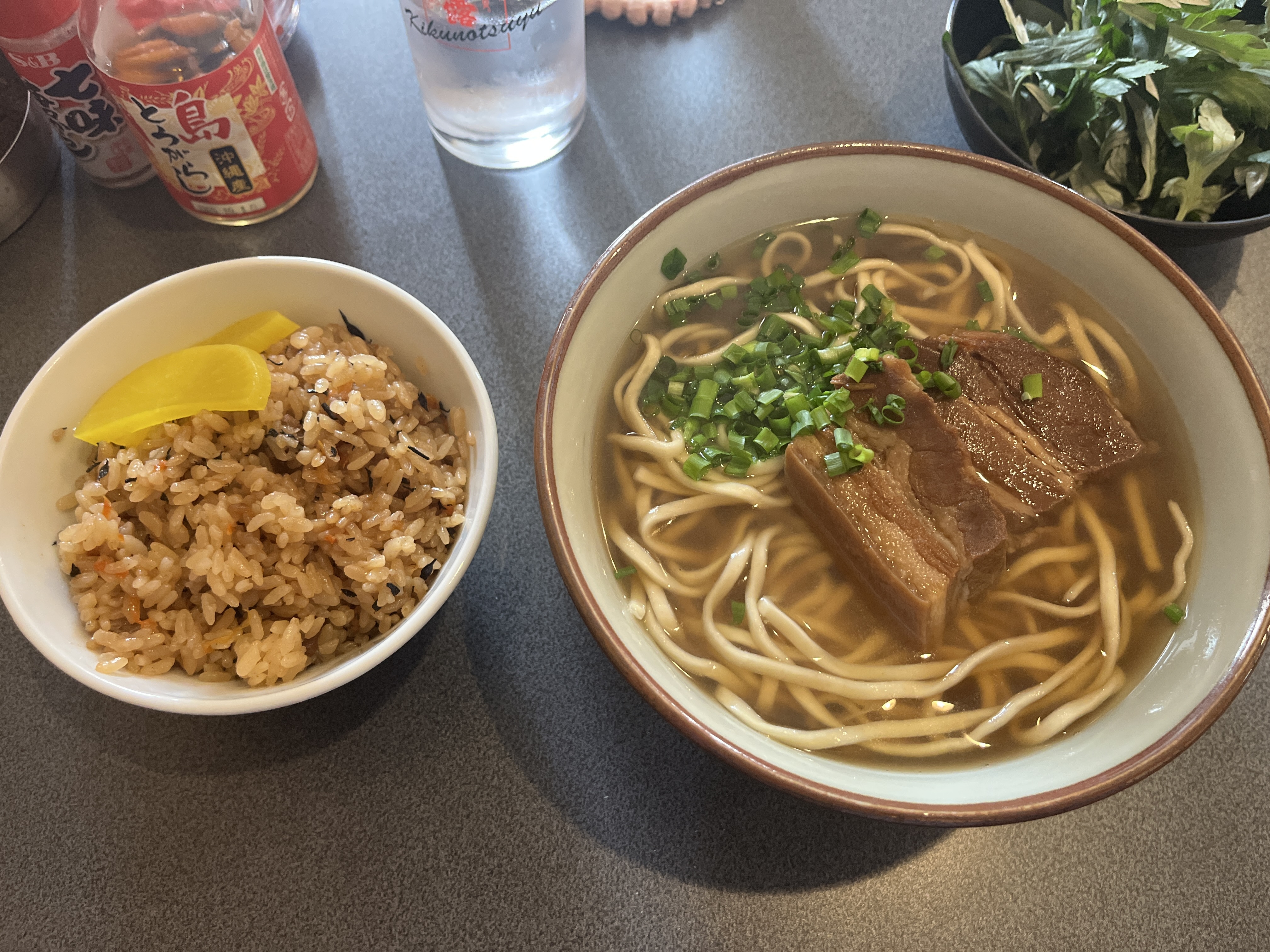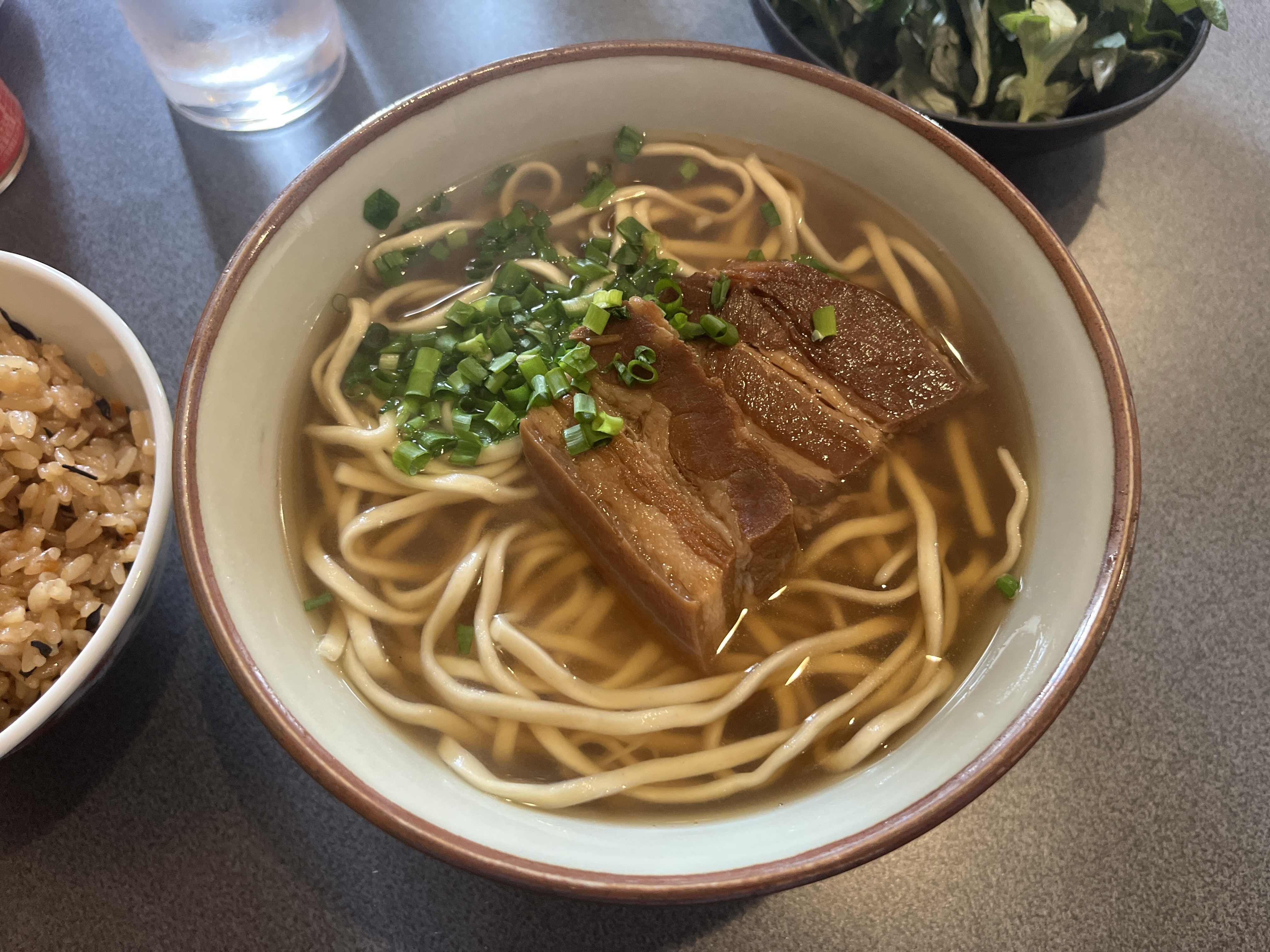 麺は玉家と同じく亀浜かな。ズルズルーっと啜った時の喉越し、噛んだ時のプチっと切れる歯ごたえ、まさに王道の沖縄そばですね。スープはカツオベースで、結構コク強めです。個人的にはもう少しあっさりが好きかなぁ