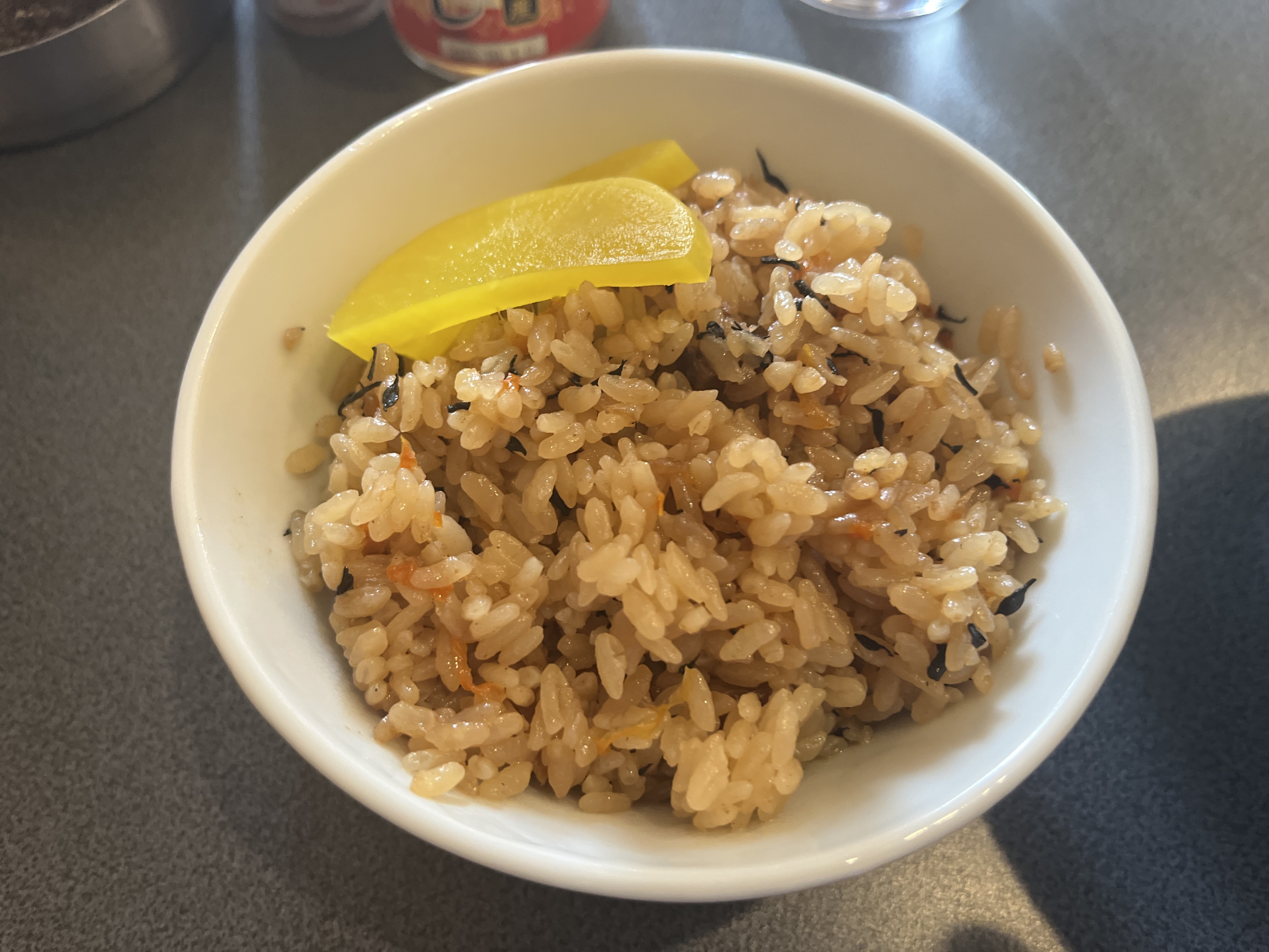 ジューシーも王道の味で美味しいですね。少しパラパラタイプ。食べていて飽きない、ちょうど良い味の濃さです。そして、たくあんがめちゃくちゃ合う!これは地味に美味しいやつ。地味にかなり美味しいやつです。