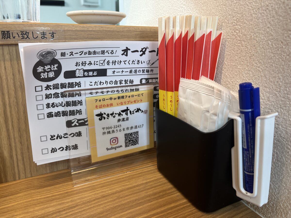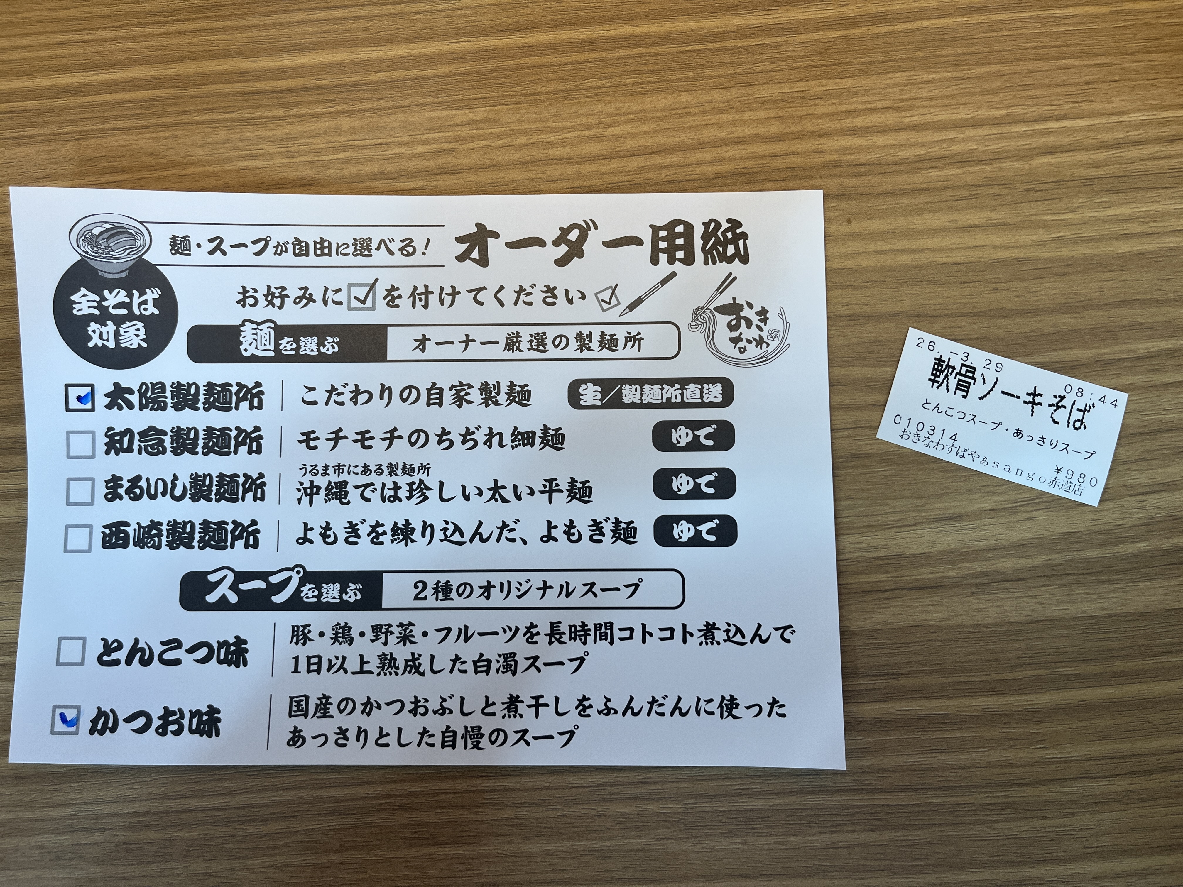 各席にオーダー用紙があるので、麺とスープを選択して記入し、食券と一緒にカウンター越しに提出します。