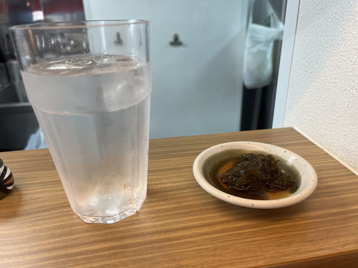 席に着くと、お冷ともずくが提供されるので、つまみながら沖縄そばを待ちます!