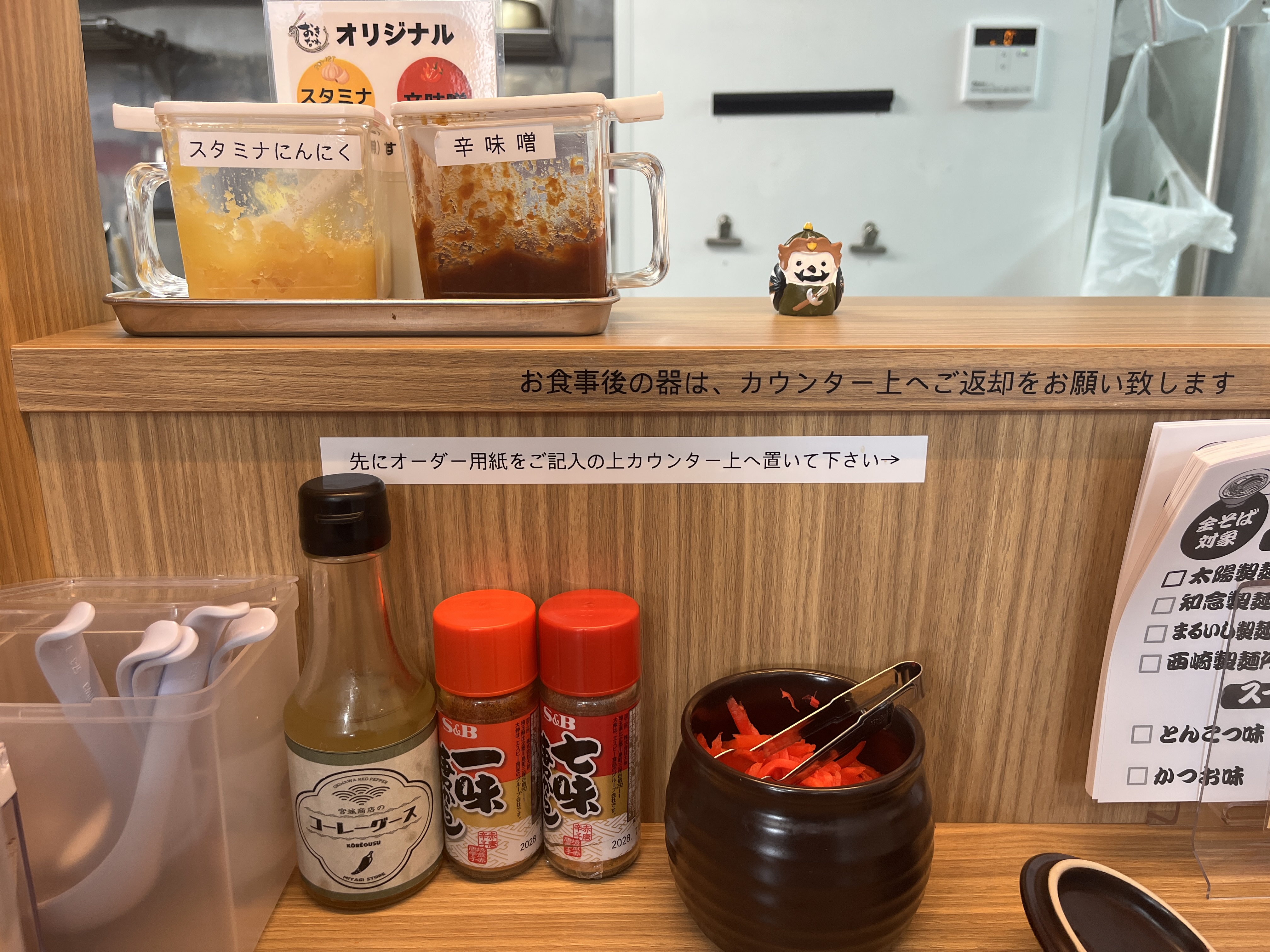 定番のコーレーグース、一味、七味、紅しょうがに加えて、オリジナルのにんにくと辛味噌もあります。こちらの店はあっさり味のイメージだったので、これはちょっと意外でした。とんこつ味に合うのかな?たぶん。