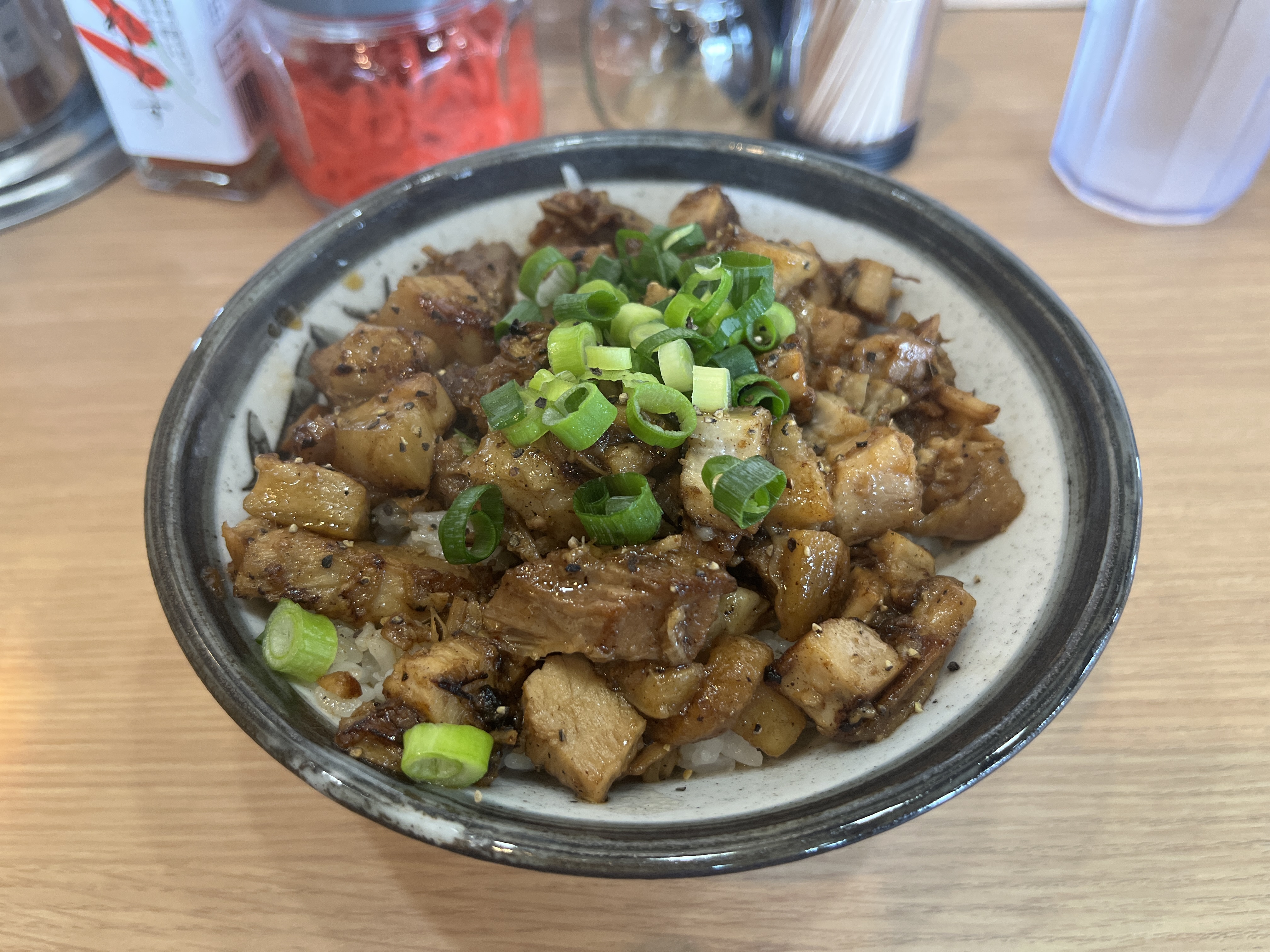 待ってる間、キッチンから香ばしくて美味しそうな香りがするなぁ〜と思っていたら、これか!そう、私が注文したのは「肉めし」いわゆるチャーシュー丼ですね。