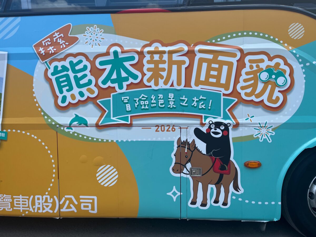 さっきは気づかなかったのですが、くまモンの絵だけでなく、「熊本なんちゃら」という文字も書かれています。このバスは熊本と何か関係があるのでしょうか?