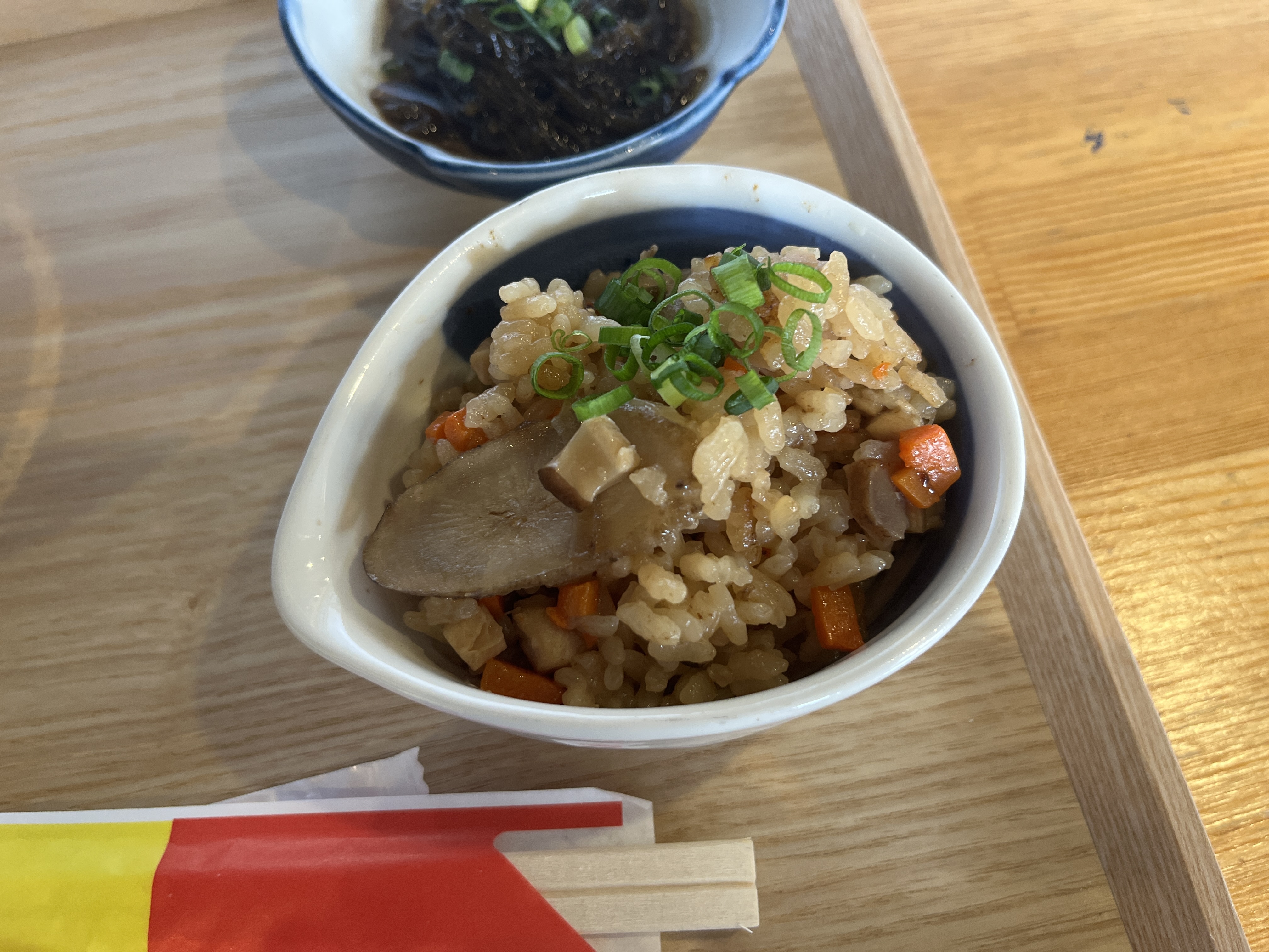 ミニかしわ飯、小さくてオサレです。女子ウケ良さそうなビジュアル。そして味は、鶏五目ご飯って感じですね。かなりコクが強いです。個人的にはコクが強いジューシーは苦手ですが、こちらのかしわ飯は好きかも。