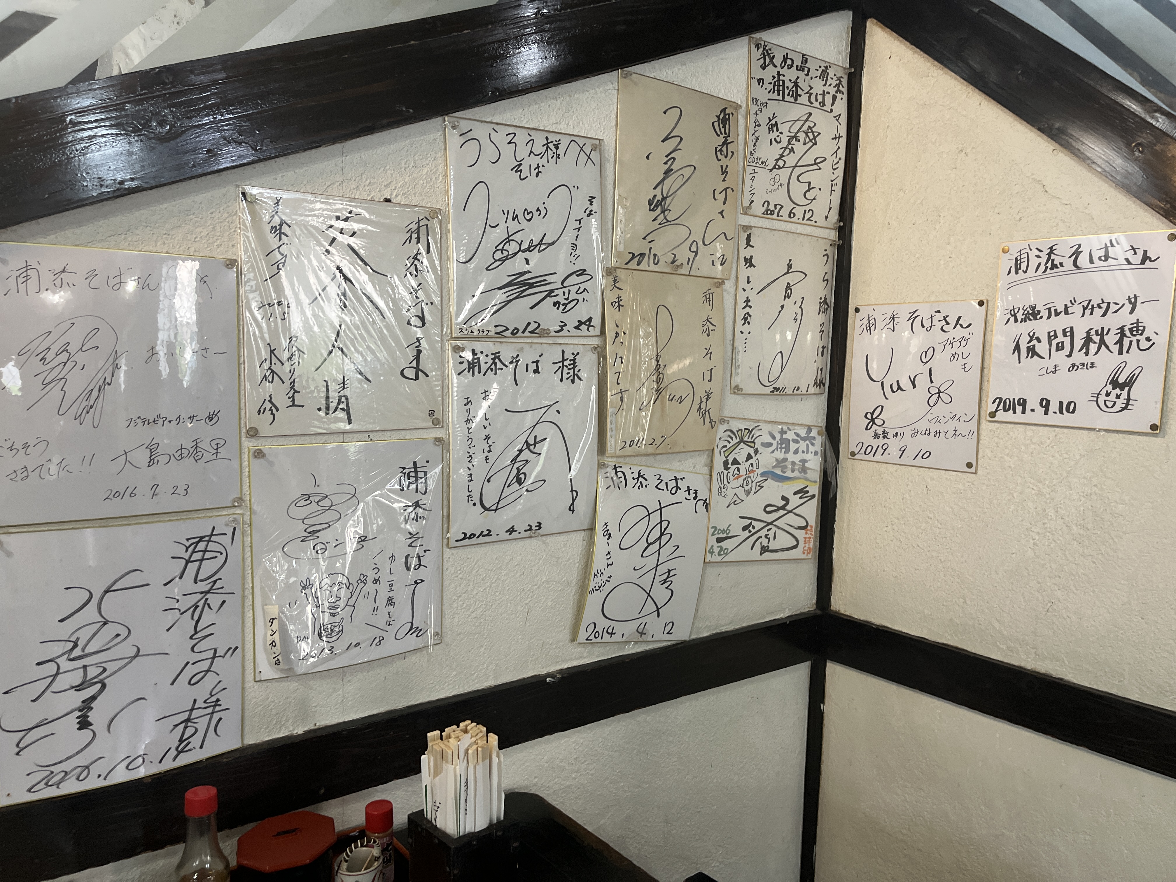 老舗あるあるで、誰かのサインが貼ってあります。でも、その大半が読めない……。
