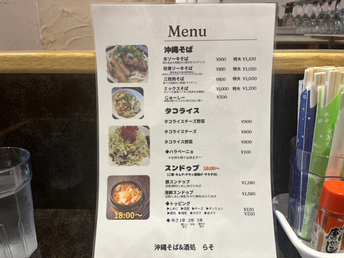 2026年2月頃オープン。名護市「沖縄そば&酒処らそ」に訪問。夜は酒処としてスンドゥブやおつまみ系、昼は沖縄そばを提供しています。