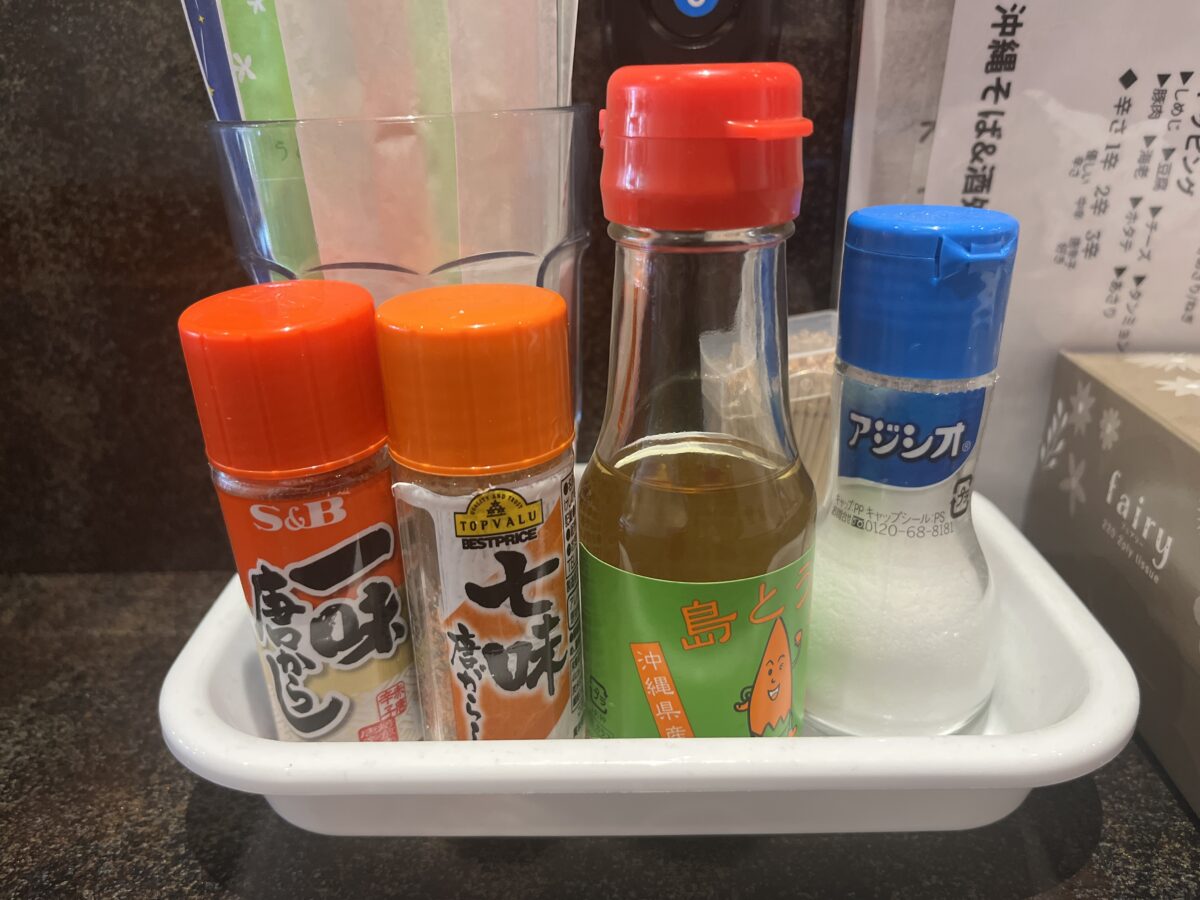 塩はちょっと珍しいですね。おそらく沖縄そば以外で使うと思うんだけど、何にかけるんだろう?