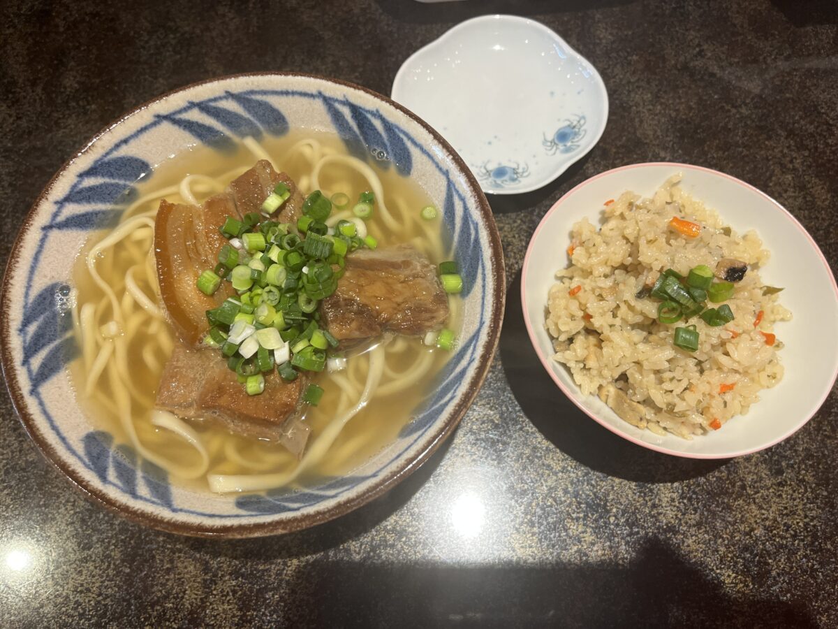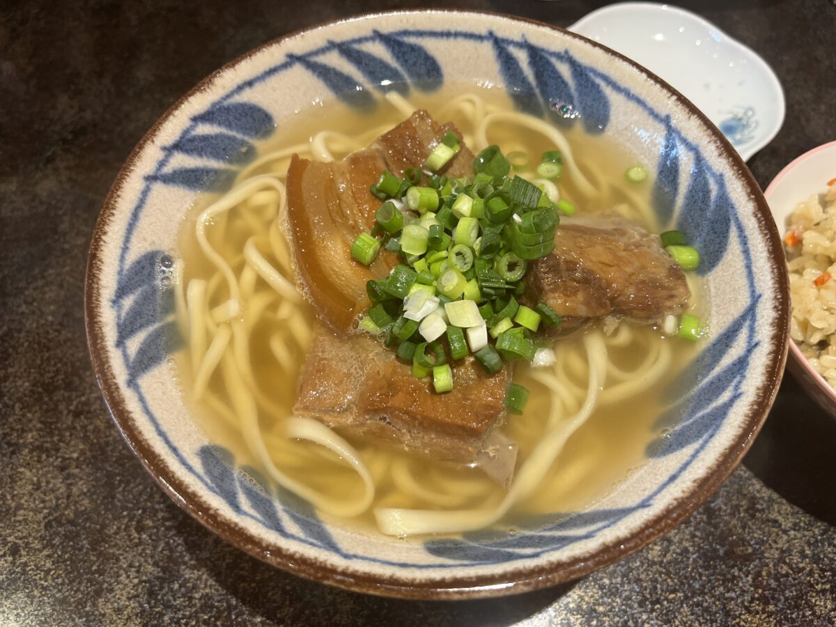 麺は平麺、スープはカツオ出し。これぞ北部・名護の沖縄そばって感じの王道沖縄そばです。