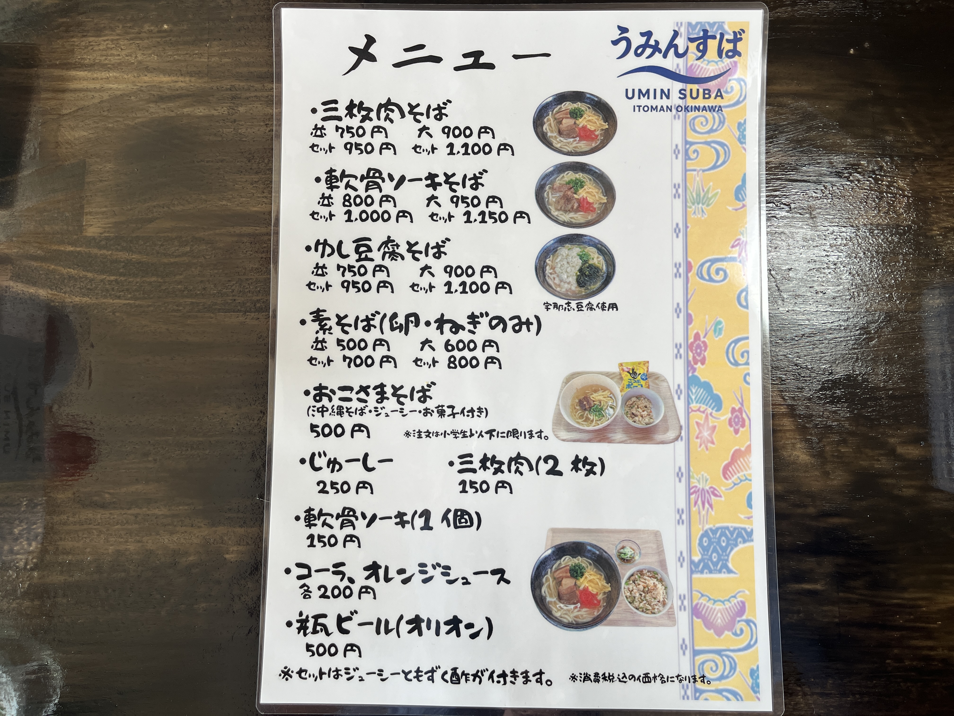沖縄そば単品はすべて1000円未満で、最近にしてはお手頃価格。ミックスそばは無いものの、三枚肉や軟骨ソーキのトッピングが可能。(訪問時は気づかなかったぁ…)