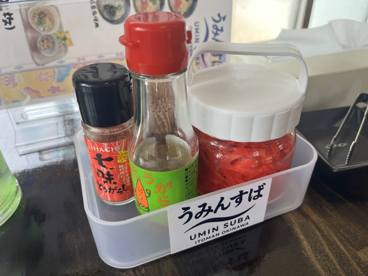 七味、コーレーグース、紅しょうが、いつもの安心セットです。