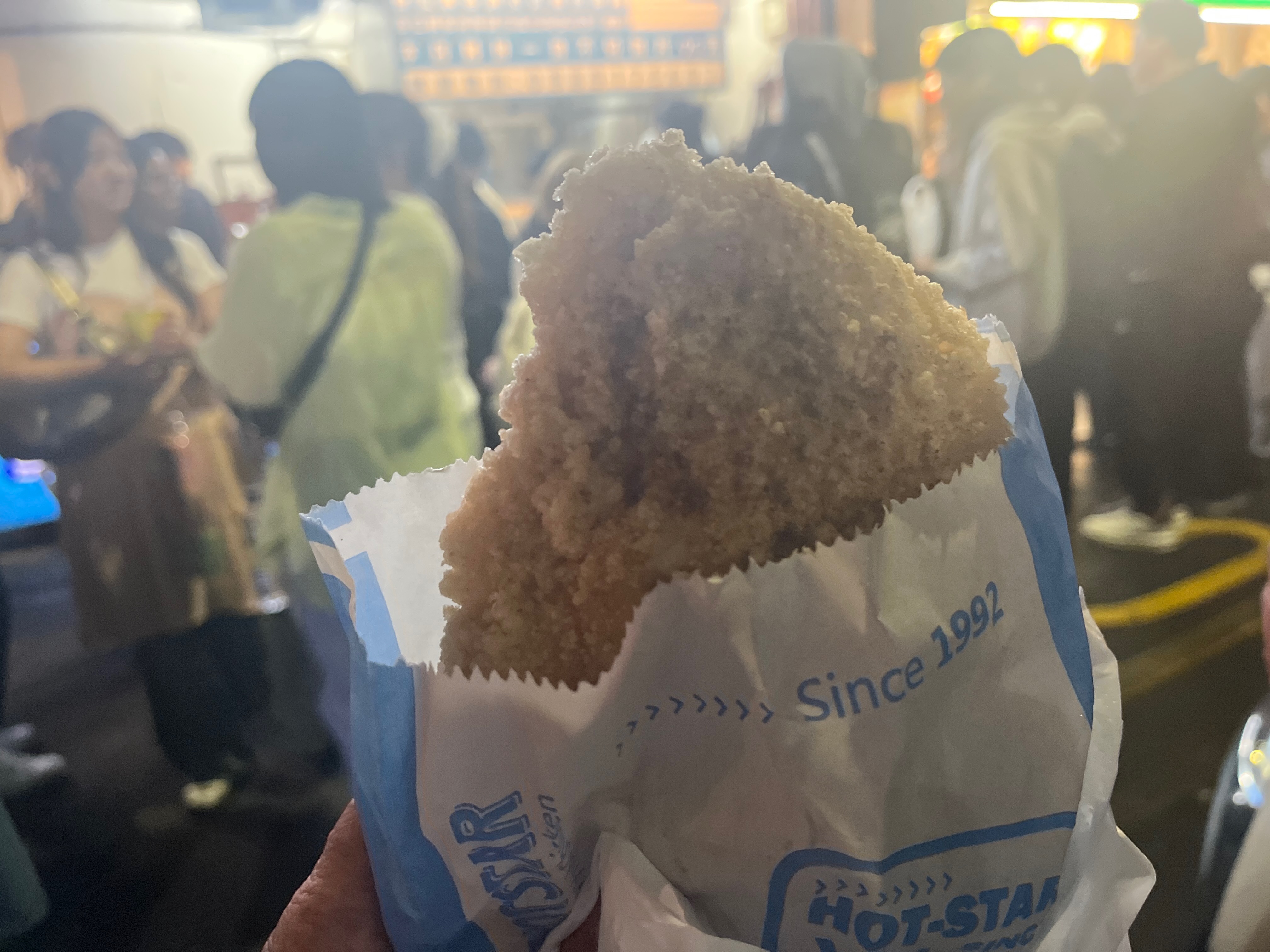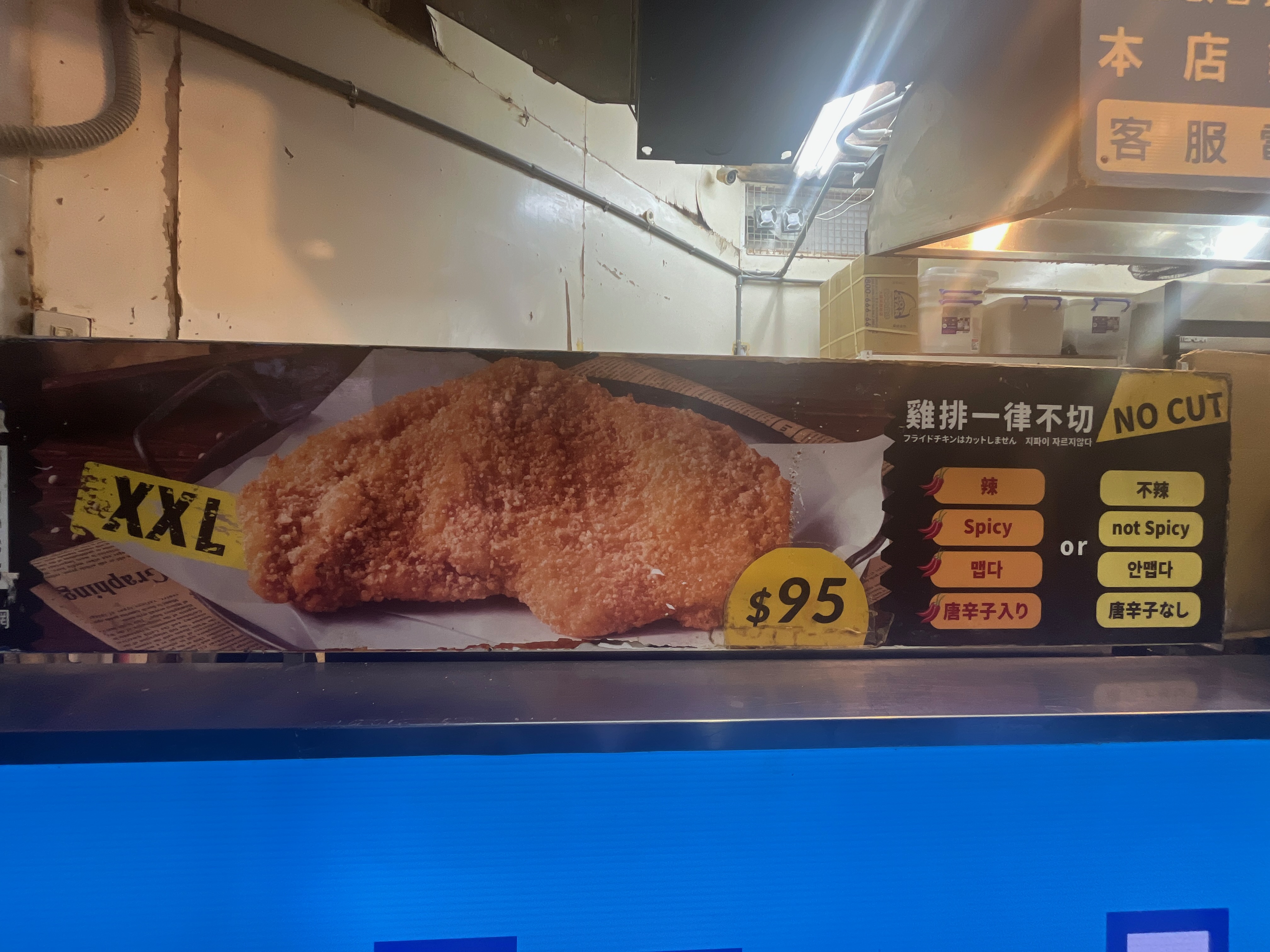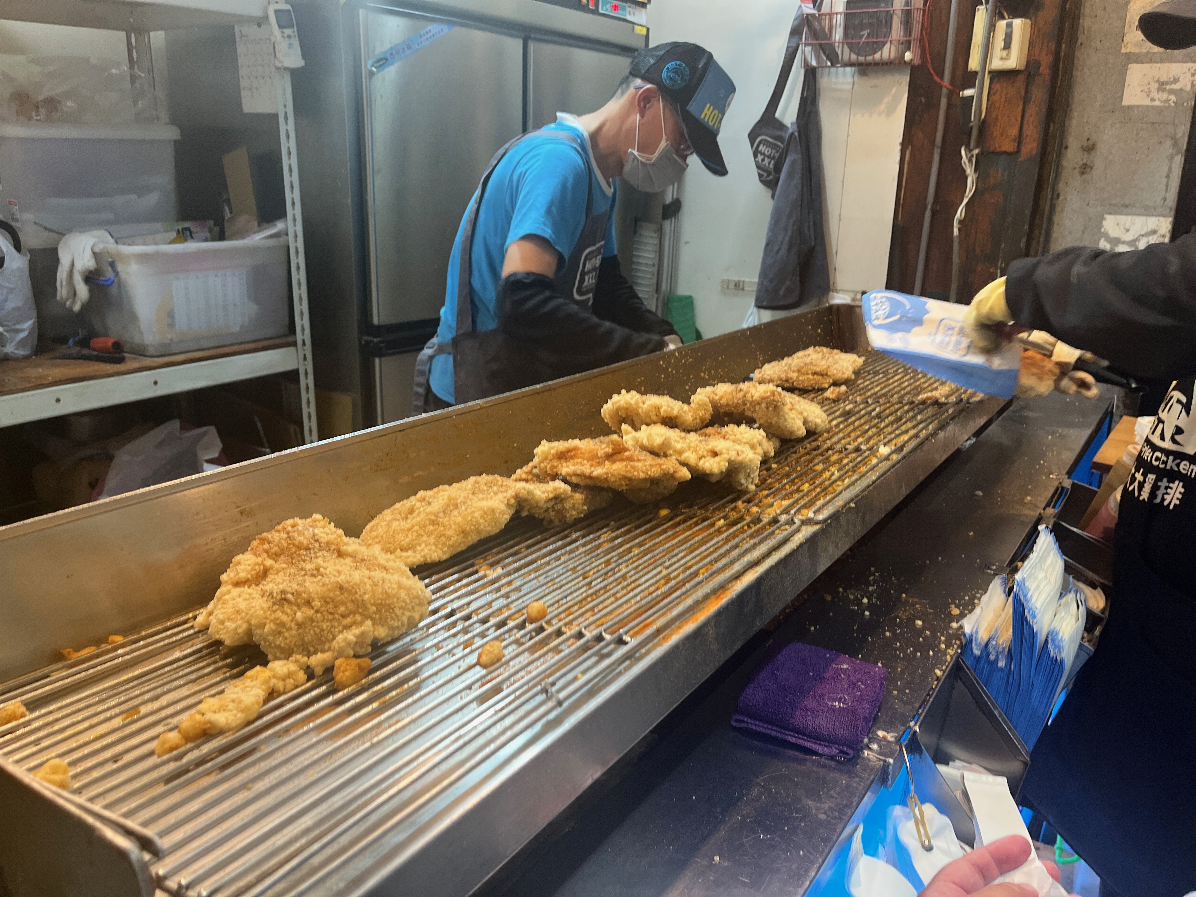 やっと行列の最前列まで来ました!この店は鶏排(ジーパイ)の店です。鶏排(ジーパイ)とは?わかりやすく言うと、でっかいファミチキです。95元で約470円。値段はファミチキの2倍ですが、大きさは4〜5倍あります!めっちゃデカいです。