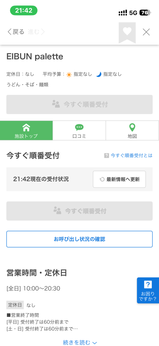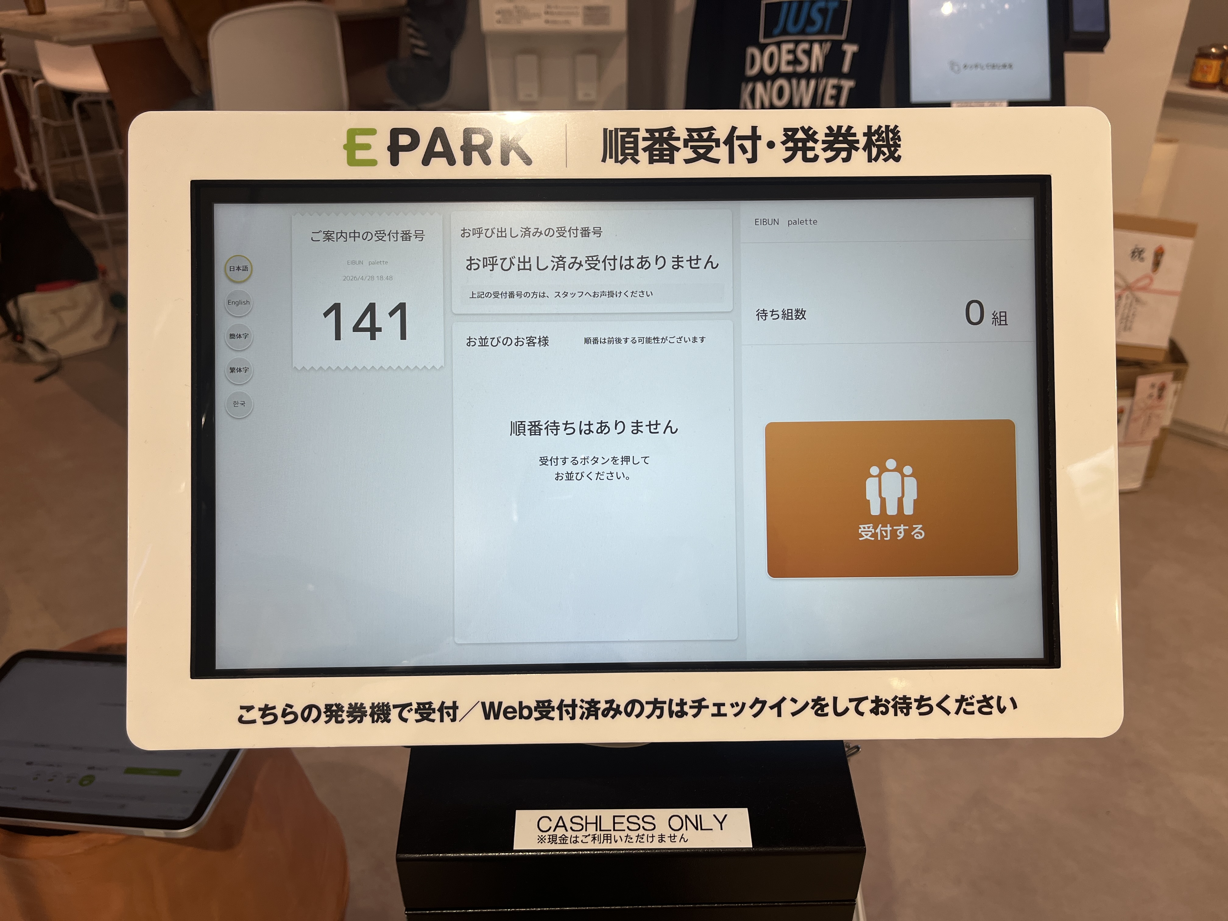 こちらで順番待ちの受付(発券)ですが、EPARK対応なので、事前にWeb受付も可能!これはかなり便利です。そして、EIBUNの本店、2号店は1〜2時間待ちも珍しくないですが、ここはパレットくもじ。時間つぶしに困らないのも大きなメリットですね。