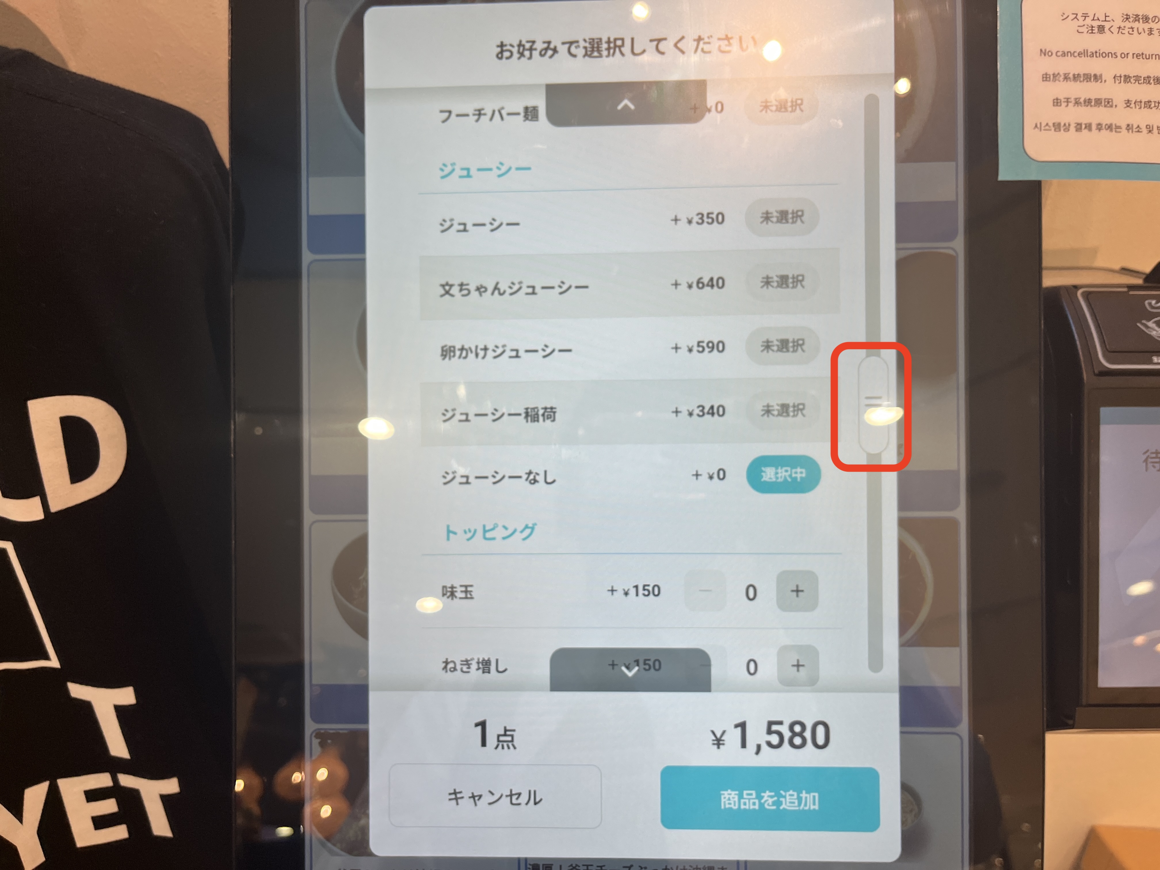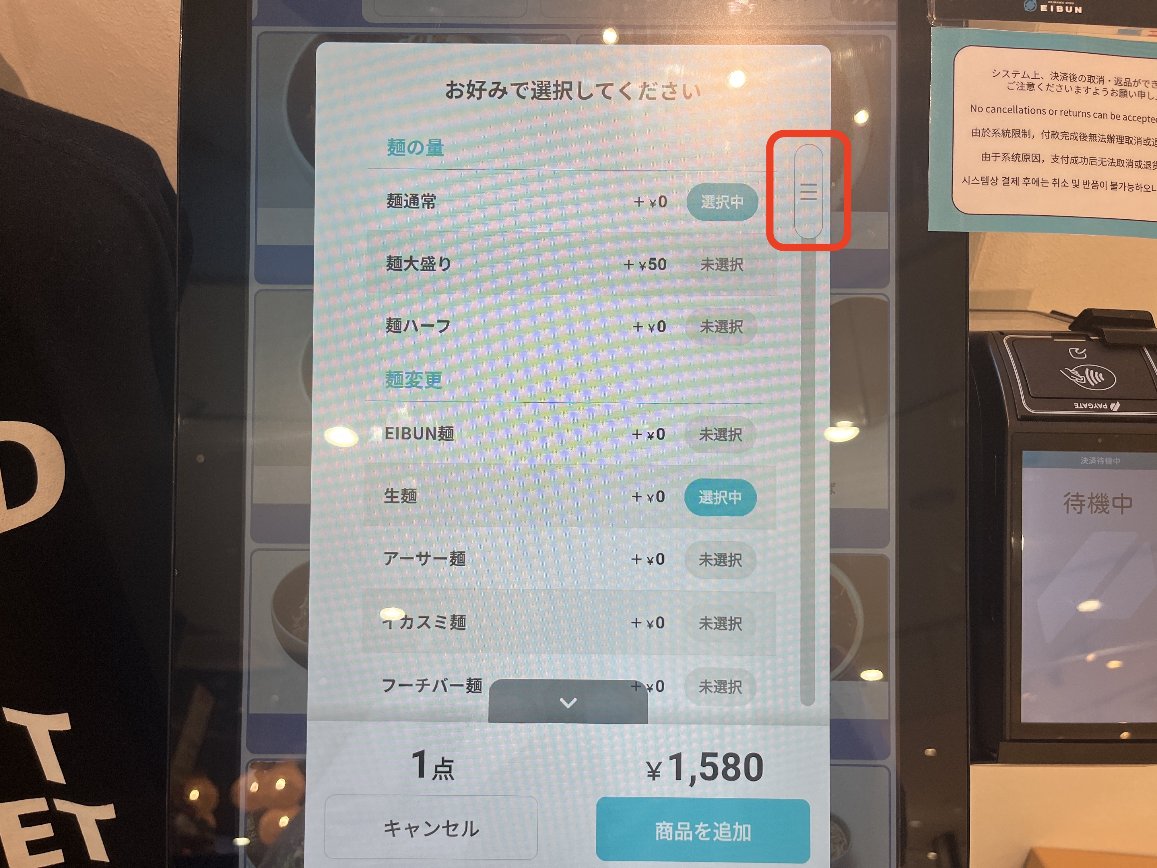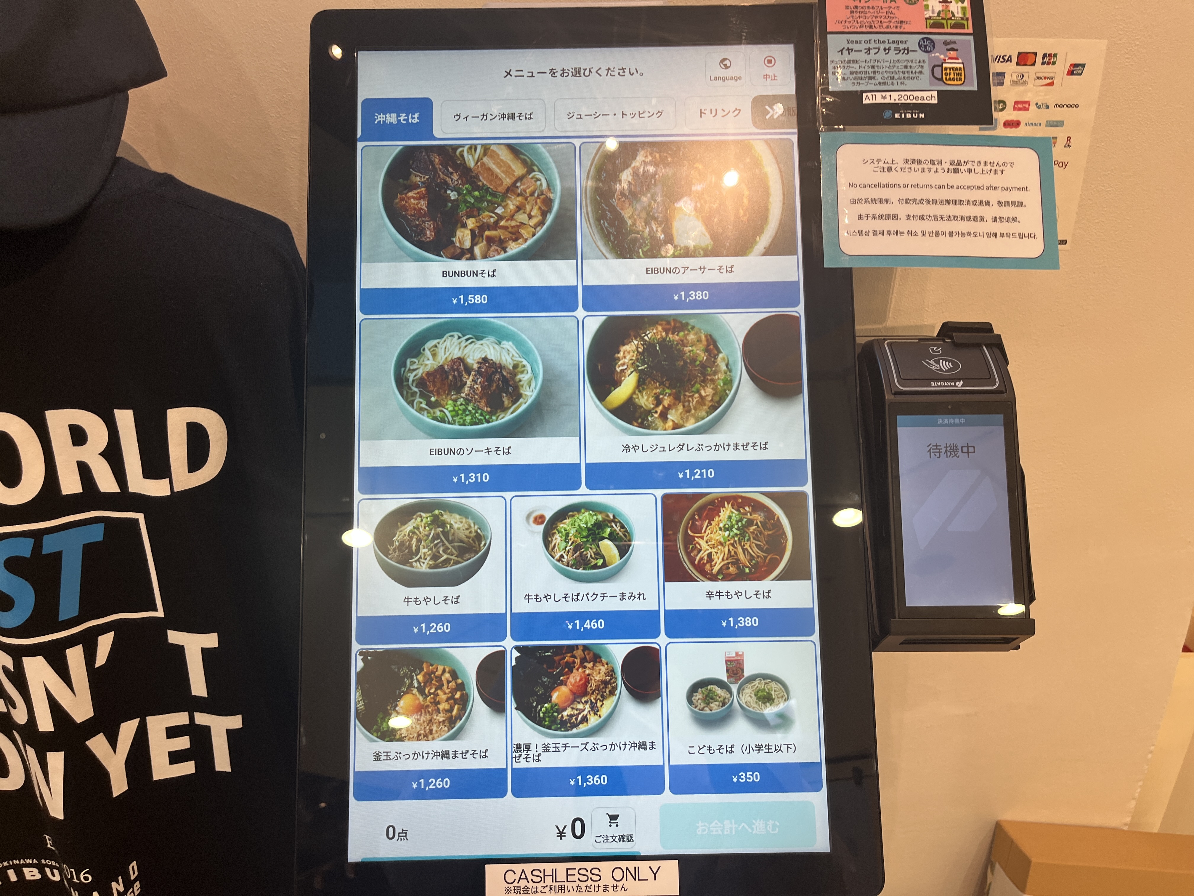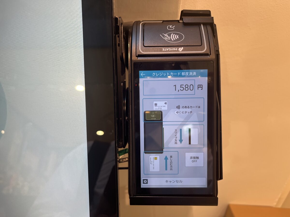 右側のキャッシュレス端末で会計すると食券が発行されます。それを店員さんに渡せば、席に案内してもらえます。